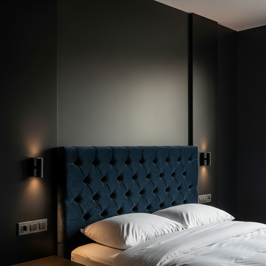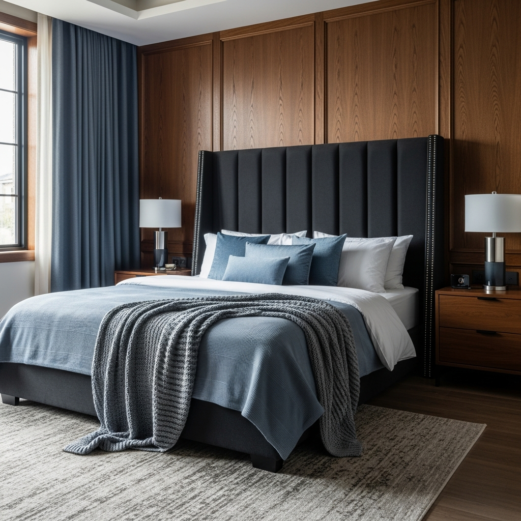 A grand velvet blue headboard instantly elevates a room, adding texture and a touch of luxury. Frame it with clean-lined black bedside tables and modern black wall sconces. This pairing creates a dramatic focal point, blending plush comfort with sharp, modern lines for a truly inviting space.