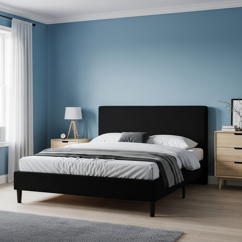 For a lighter, more airy feel, pair soft sky blue walls with a plush charcoal grey upholstered headboard. Keep furniture silhouettes clean and simple, perhaps a low-slung bed and floating shelves. This combination creates a serene, calming atmosphere, with black elements subtly grounding the space without overwhelming it.