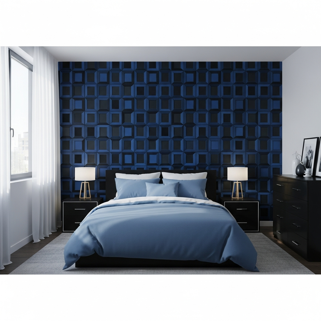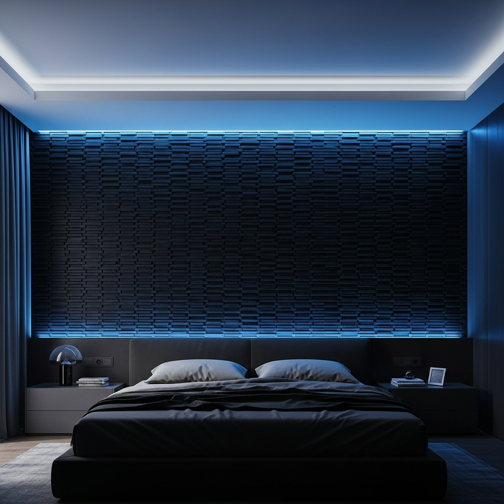 Experiment with a textured black accent wall โ think slat panels, fabric wallpaper, or even a deep charcoal paint with a matte finish. Then, incorporate innovative blue LED strip lighting behind the headboard or under furniture to cast a soft, ethereal blue glow. This creates a dramatic, futuristic, and incredibly modern atmosphere.