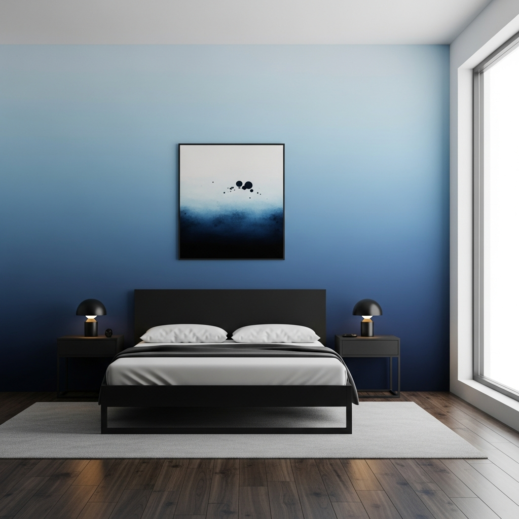 Create a captivating focal point with an ombre wall, fading from a deep, almost black-blue at the base to a lighter sky blue towards the ceiling. Furnish the room with clean-lined black furniture that does not compete with the wall art. This creates a sense of depth and artistic flair, truly modern and unique.