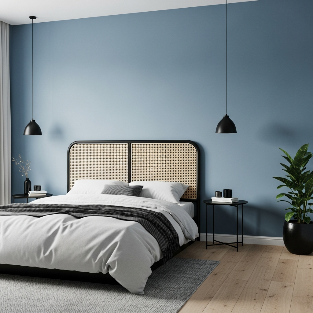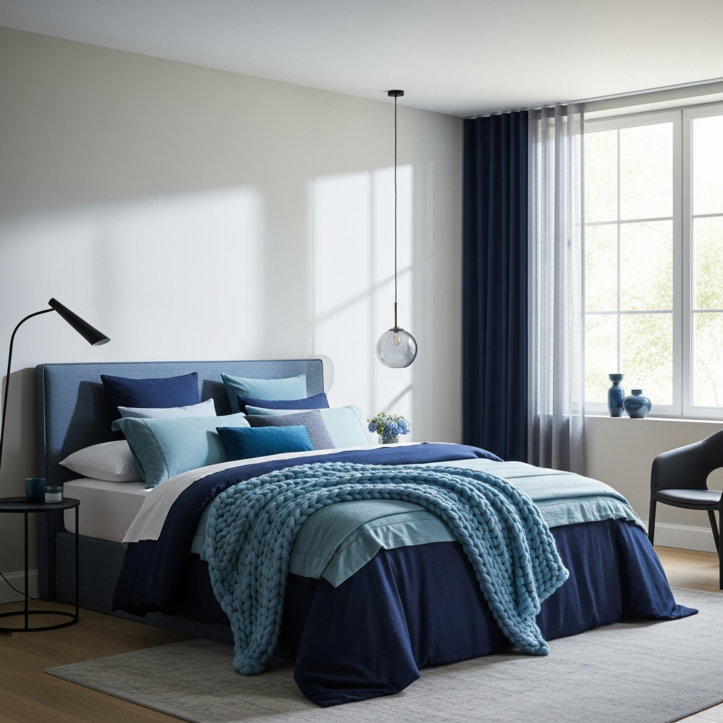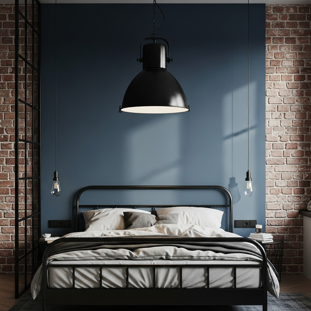 Embrace an industrial aesthetic with exposed brick or concrete textures. Introduce a deep, moody blue on one wall and pair it with a sleek black metal bed frame and raw black steel shelving. Accents like a black factory-style lamp or a distressed blue rug will complete this urban, modern look.
