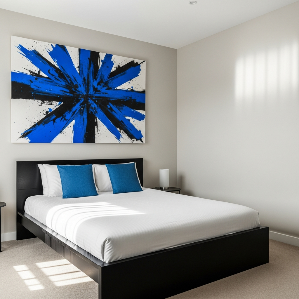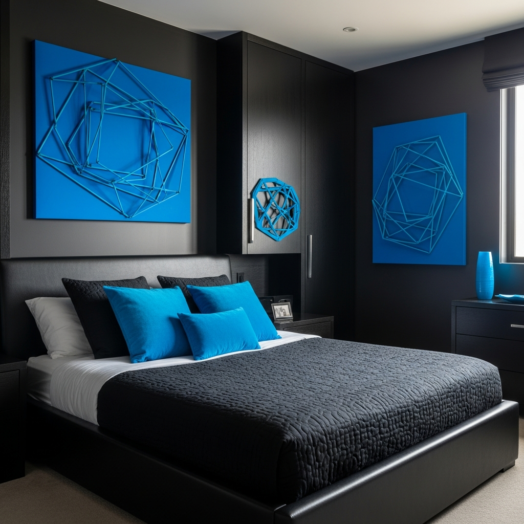 Start with a minimalist black bedroom โ think black walls, black bedding, and black furniture. Then, introduce a jolt of energy with electric blue accents. This could be a striking piece of abstract art, a pair of vivid blue bedside lamps, or a bold rug. The dramatic contrast delivers a truly modern and edgy vibe.