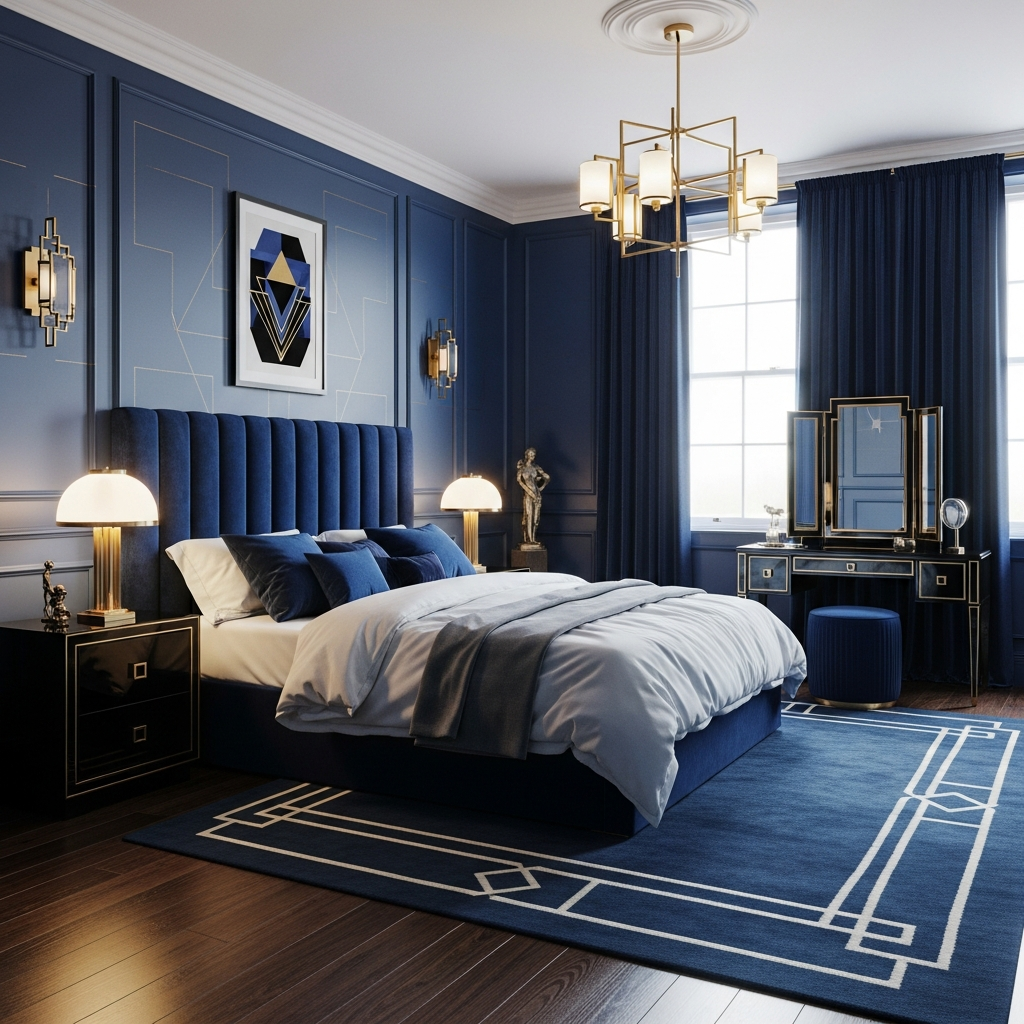Combine the drama of black with the richness of royal blue or teal, and introduce touches of gold or brass for an Art Deco-inspired glam. Think a black and gold bedside table, a velvet blue armchair, and geometric patterns in the rug or lighting. This creates a luxurious and sophisticated atmosphere.