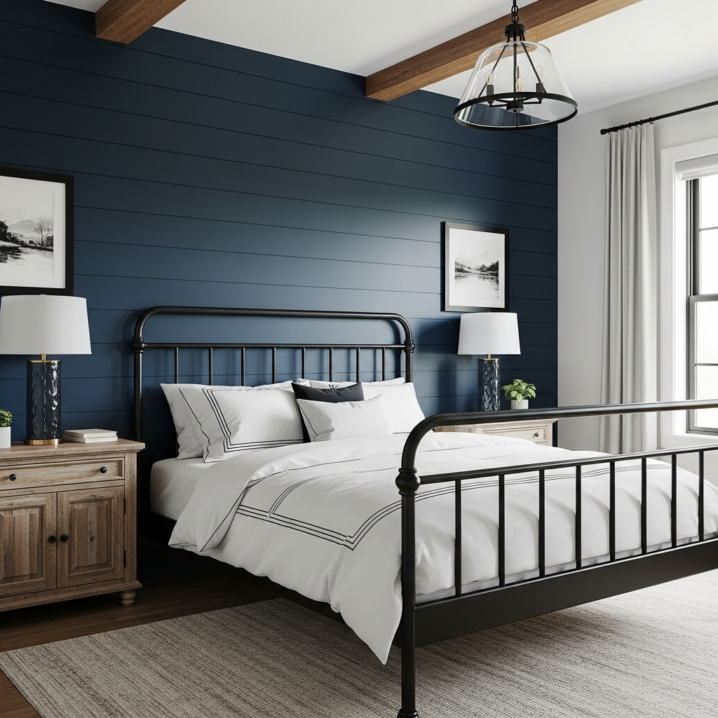 Give the popular farmhouse style a modern, moody twist. Use a deep navy blue for shiplap walls or a painted accent wall. Pair it with a classic black wrought iron bed frame and distressed black wooden nightstands. The contrast between the rustic textures and the sharp black and blue creates a uniquely charming yet contemporary feel.