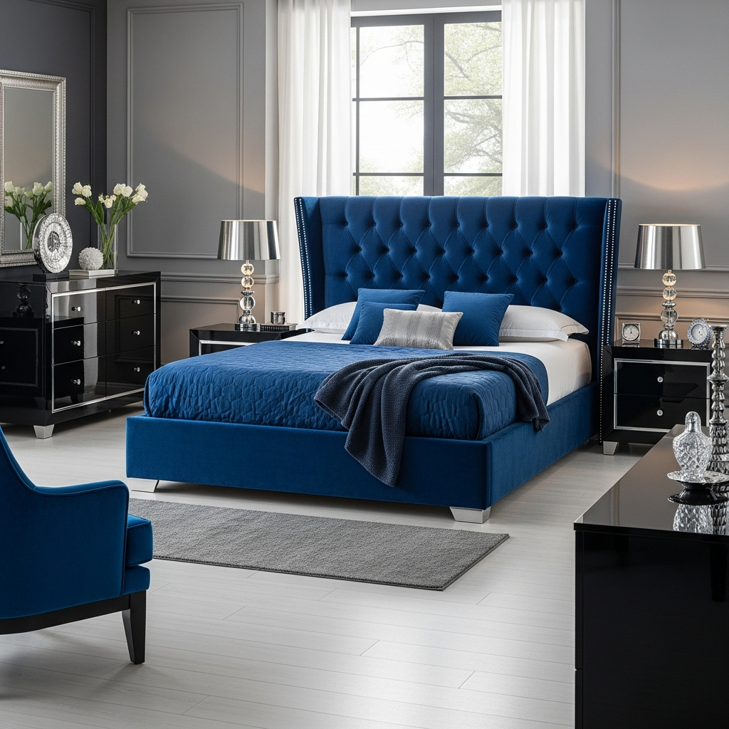Make a statement with a bold royal blue upholstered bed or a plush accent chair. Complement this with high-gloss black lacquered nightstands and a dresser. The shiny black surfaces reflect light beautifully, creating a glamorous and striking modern aesthetic that truly pops.