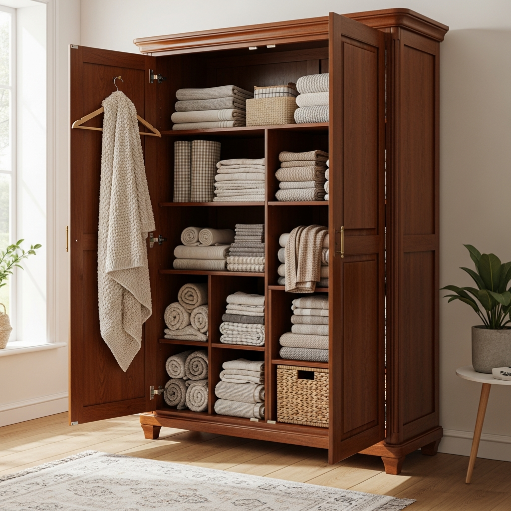 This grander solution allows you to store a larger collection of blankets, keeping them pristine and neatly folded behind closed doors. An armoire acts as a significant furniture statement, bringing a touch of refined elegance and practical organization to your bedroom or dressing area.