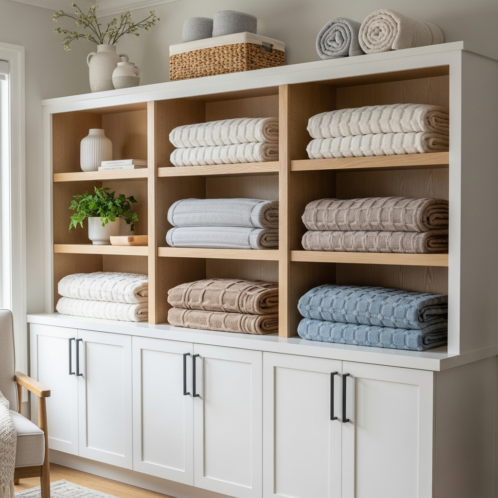If you are designing a custom space or have existing built-ins, incorporate open shelving specifically for your blankets. Rolled or folded neatly, blankets can be arranged on shelves alongside books, decorative objects, and framed photos. This creates a bespoke, tailored look that feels both luxurious and organized.