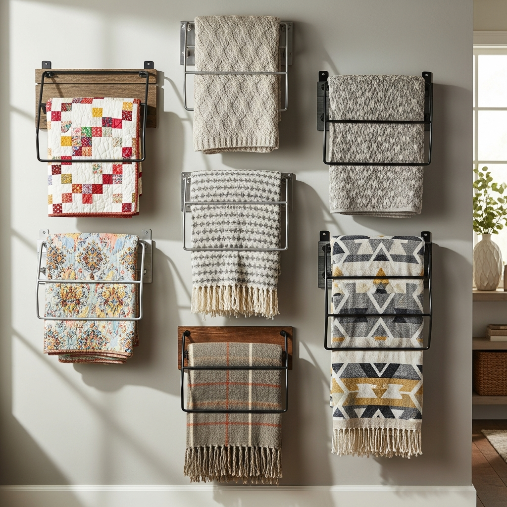 For a truly unique and space-saving solution, consider a wall-mounted quilt rack. These racks are designed to showcase treasured quilts or blankets as art pieces. Choose a minimalist design in sleek metal for a modern look, or a rustic wood rack for a farmhouse-inspired home. They keep blankets off the floor and add an intriguing focal point to an empty wall.