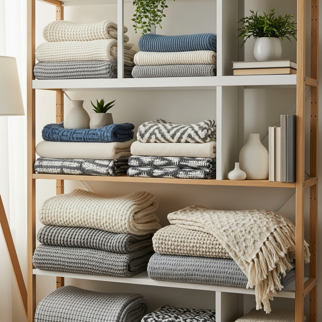 Transform a simple bookshelf or wall-mounted open shelves into an elegant blanket display. The key here is curation and neatness. Fold blankets uniformly and stack them in aesthetically pleasing piles. Vary textures and colors slightly to add visual interest without creating chaos.