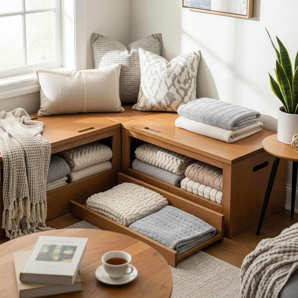 Maximize underutilized corner spaces with a custom or ready-made corner bench that incorporates hidden storage. Perfect for breakfast nooks, mudrooms, or even spacious living rooms, these benches offer ample seating and a discreet place for blankets.