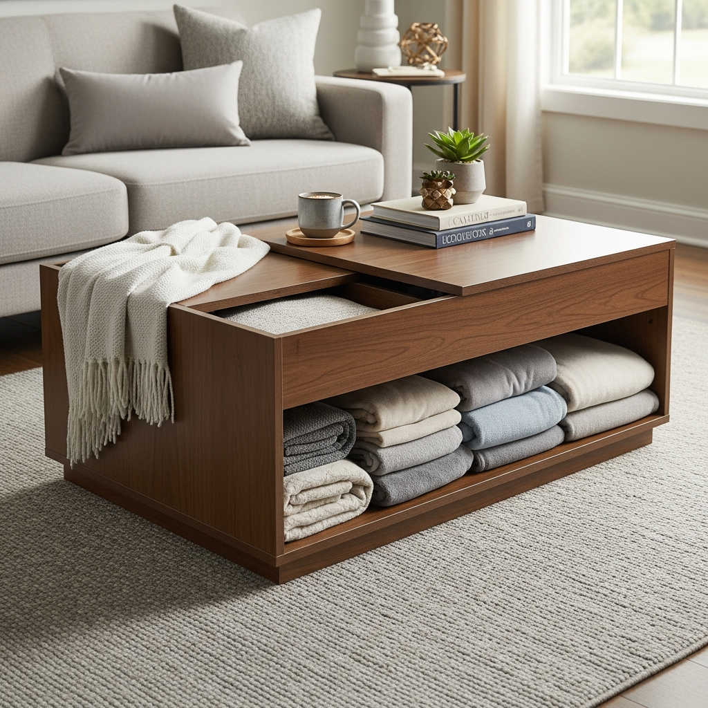 The beauty of this solution is its seamless integration. Your coffee table functions as a central decor piece, a surface for drinks and decor, and a secret blanket hideaway, making your living area feel effortlessly organized and stylish.