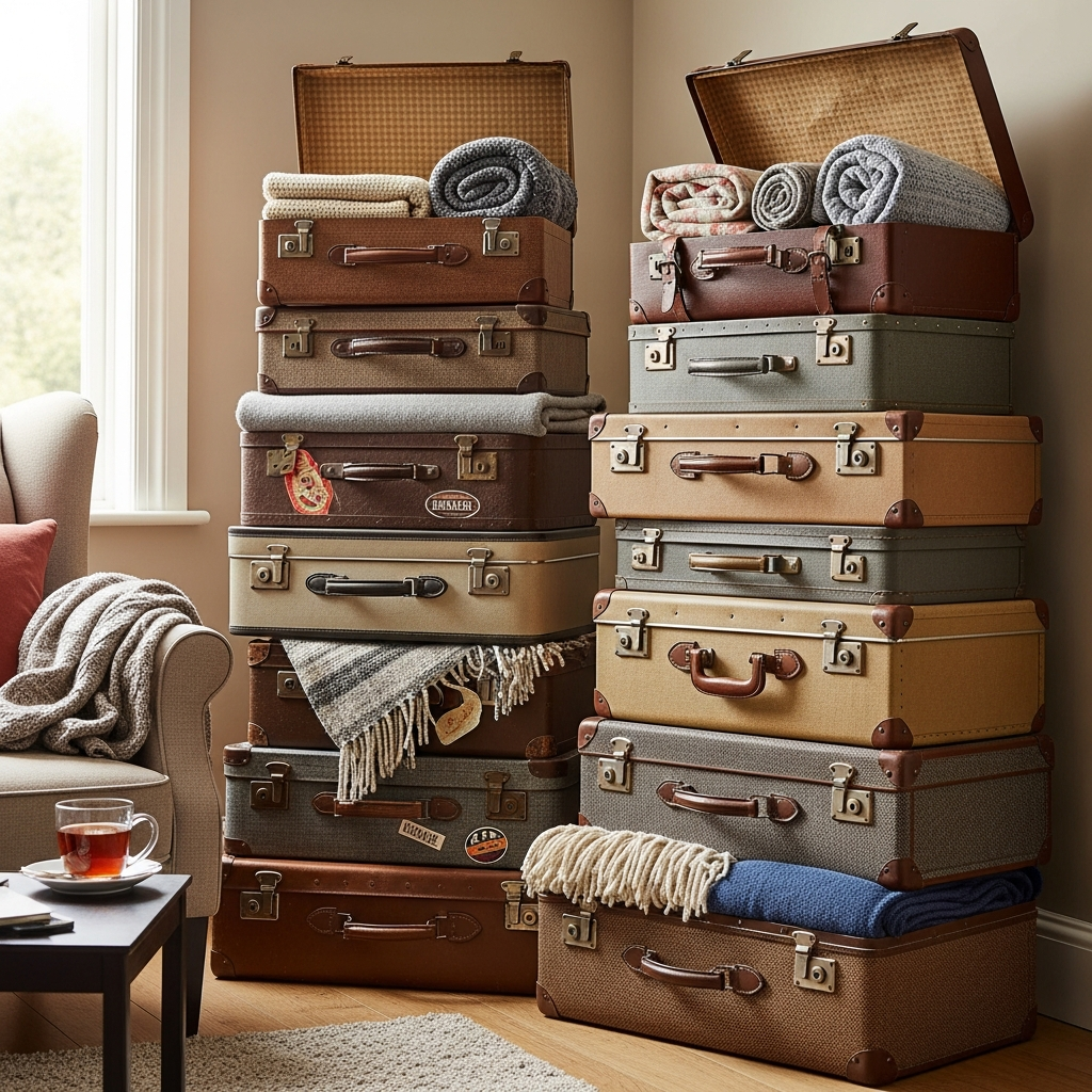 While they may not be as accessible for daily use, these suitcases provide a charming spot for storing seasonal or guest blankets. The varying sizes and rich textures of the luggage add an eclectic and personal touch to your decor, evoking a sense of adventure and nostalgia.