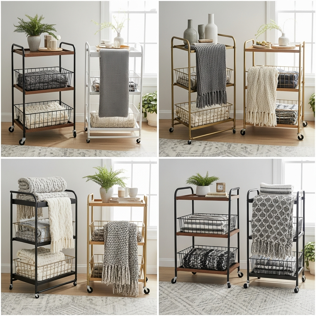 Arrange your blankets in neat stacks or rolls on one of the shelves, perhaps alongside a stack of magazines or a small plant. A rolling cart introduces an industrial-chic or contemporary vibe, perfect for those who appreciate functional design with an edgy touch.