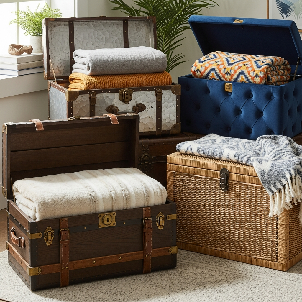 Channel vintage charm or a global travel aesthetic with a decorative trunk or chest. An antique wooden chest with metal accents can bring a sense of history and warmth to a living space, while a brightly colored, hand-painted trunk can add a vibrant pop of personality. These pieces often offer generous storage capacity, ideal for bulkier blankets.