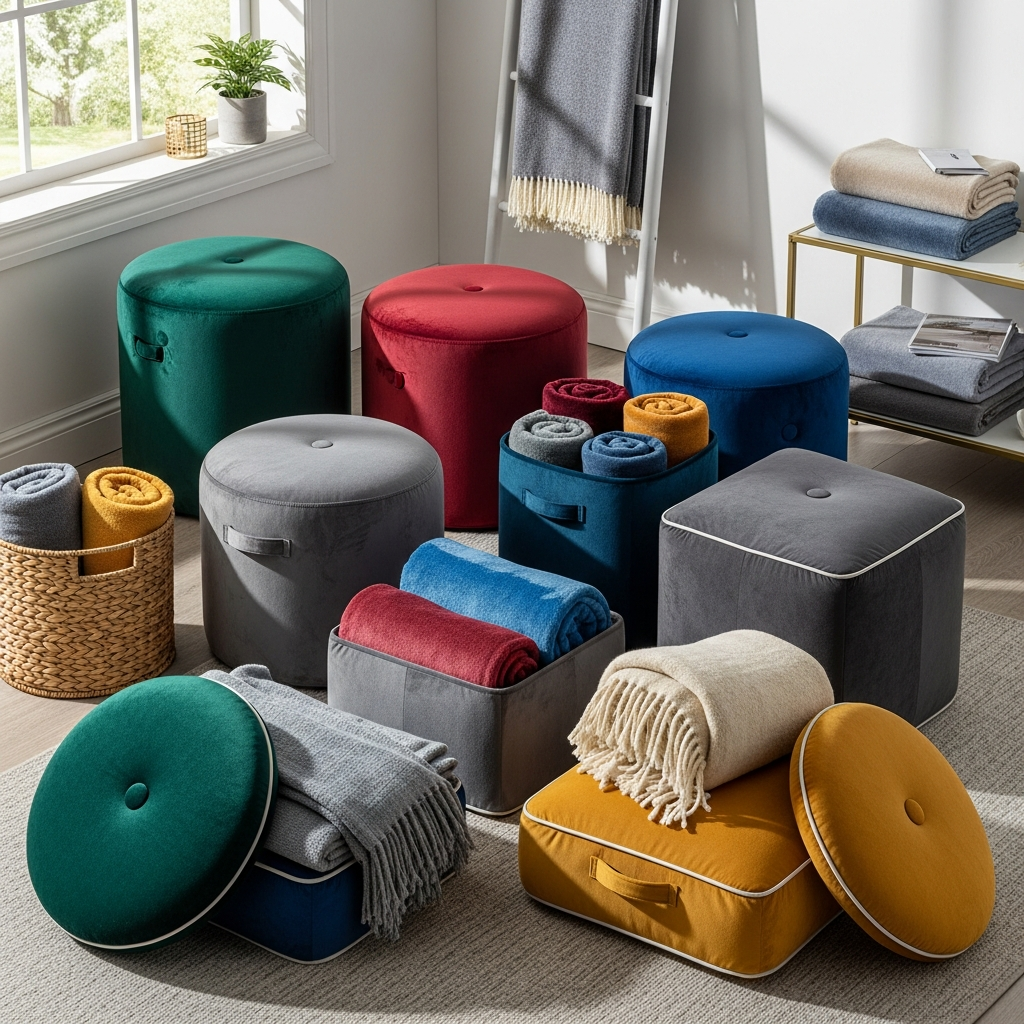 A velvet storage pouf offers a touch of luxury and softness, doubling as extra seating or a footrest while hiding blankets within. Choose rich, deep colors like forest green, burgundy, or midnight blue to infuse a sense of opulence into your living room or bedroom. The plush texture of velvet is inherently inviting and stylish.