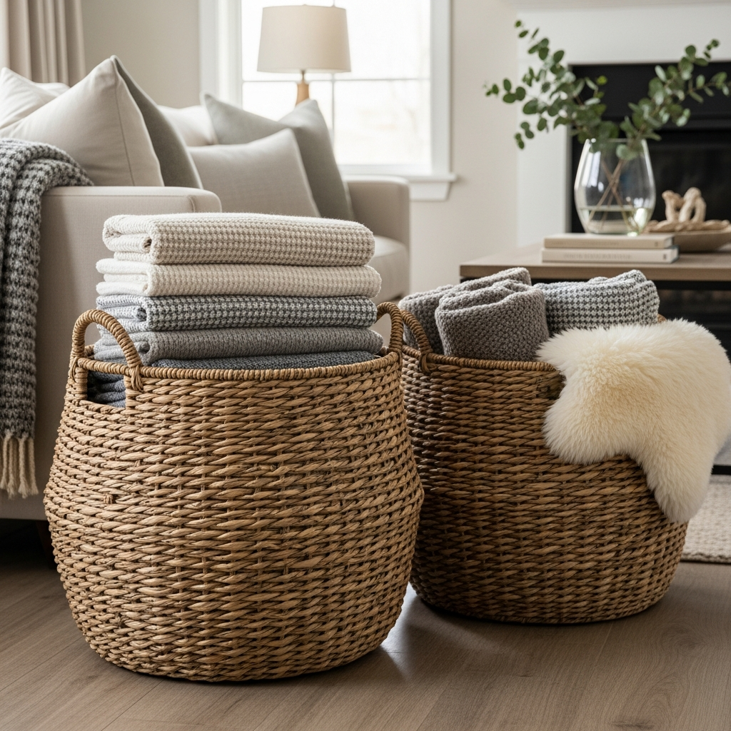 Select baskets with sturdy handles or interesting patterns to make them truly stand out. A set of varying sizes clustered together creates a dynamic visual display, inviting you to tuck away throws while still keeping them accessible. Position them beside a plush sofa in the living room or at the foot of your bed, brimming with soft, inviting blankets, adding both function and a stylish, tactile element.