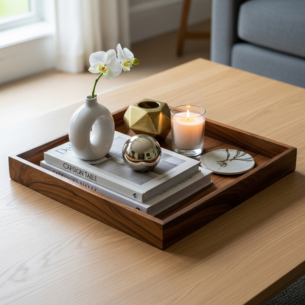 Trays are a decorator’s best friend. Select a tray in a rich material like polished brass, lacquered wood, or veined marble. Use it to corral smaller items, creating a contained vignette. Inside, place a small, low vase with fresh flowers, a decorative object, and perhaps a stylish candle. The tray instantly makes the arrangement feel intentional and tidy.