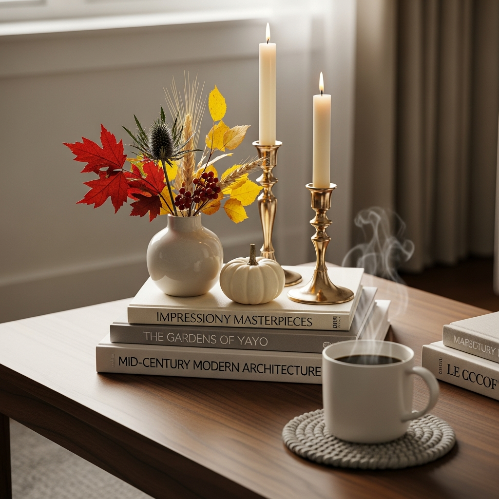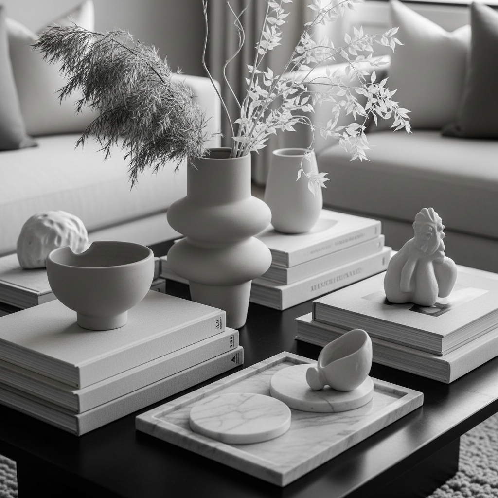 Select a single color family and build your entire arrangement around it. For example, use various shades of cream, beige, and white, incorporating different textures like a chunky knit throw, a creamy ceramic vase, and light-colored books. This creates a serene, sophisticated look that is incredibly calming to the eye.
