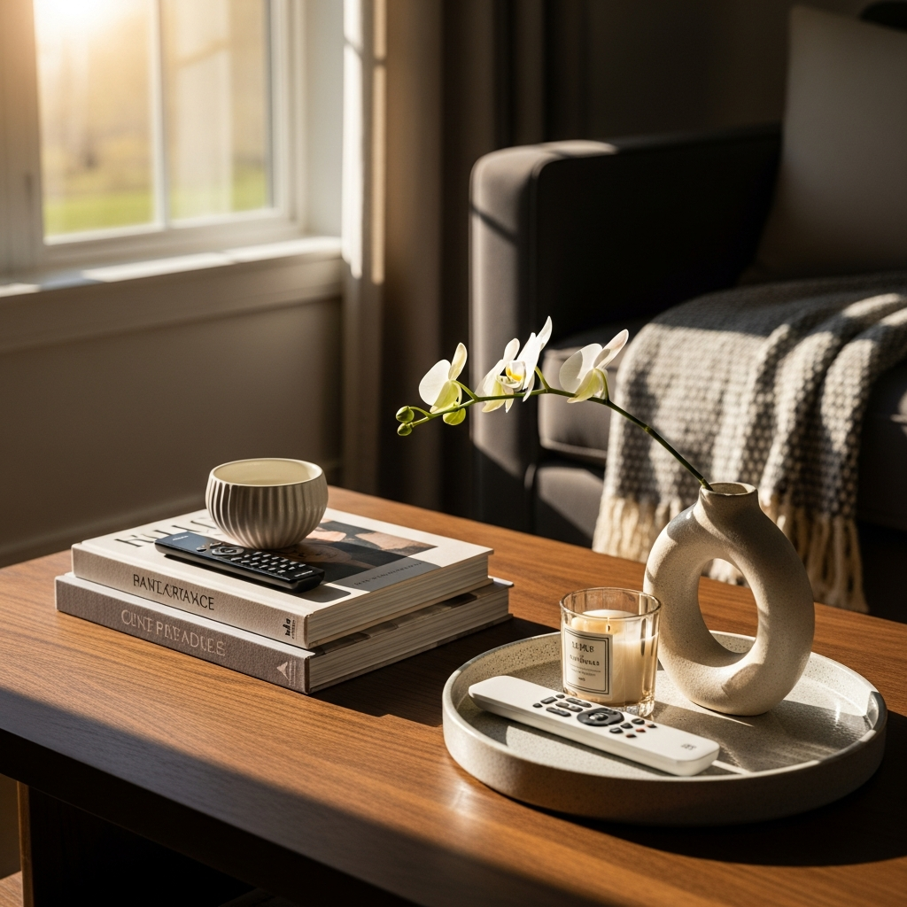Even everyday items can be beautiful. Choose stylish coasters made of marble or polished wood. Select a remote control holder that is a decorative box in itself. Keep a small, elegant notepad and pen for quick notes. When functional items are chosen for their aesthetic appeal, they seamlessly integrate into an elegant display.