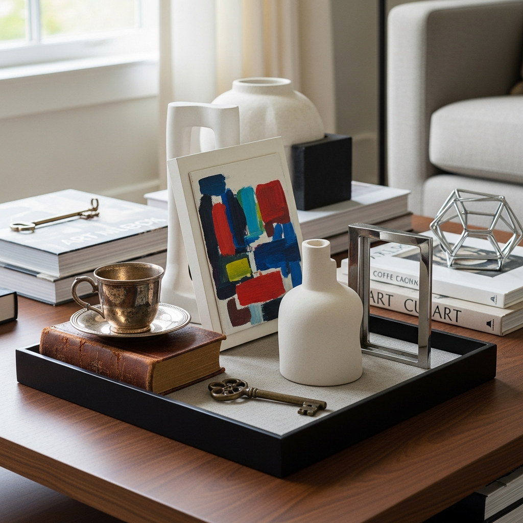 Combine the charm of the past with the clean lines of the present. Perhaps a vintage silver or brass box, an antique magnifying glass, or an old leather-bound book. Pair these with a small, abstract modern sculpture or a contemporary geometrically shaped vase. This juxtaposition creates a dynamic and interesting display.