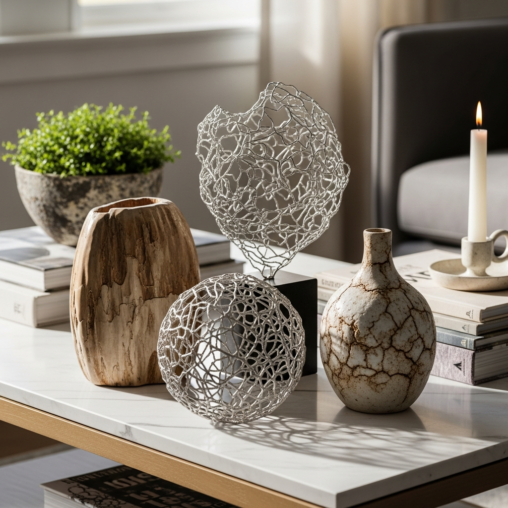 Introduce an object that serves as a piece of art. This could be a ceramic sculpture with an intriguing shape, a polished stone, or a unique metal piece. Look for items with smooth lines and tactile surfaces. Pair it with something natural, like a small air plant or a single monstera leaf in a slender vase, to soften the look.