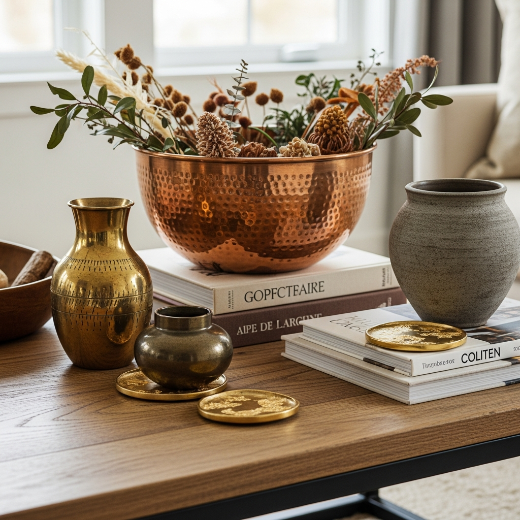 Incorporate elements with a luxurious sheen. Think a hammered brass bowl, a brushed gold decorative sphere, or a copper planter. Combine these with vessels made from contrasting textures, such as matte ceramic, ribbed glass, or rough terracotta. The interplay of smooth metals and earthy textures creates visual interest and depth.