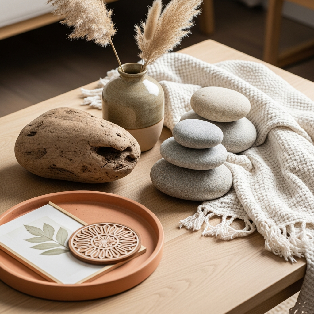Focus on pieces with soft, rounded edges and comforting textures. Think a pebble-shaped dish, a wavy-edged vase, or a soft cashmere throw folded neatly over the edge of the coffee table. These elements bring a sense of comfort and approachability, making the space feel more inviting and cozy.