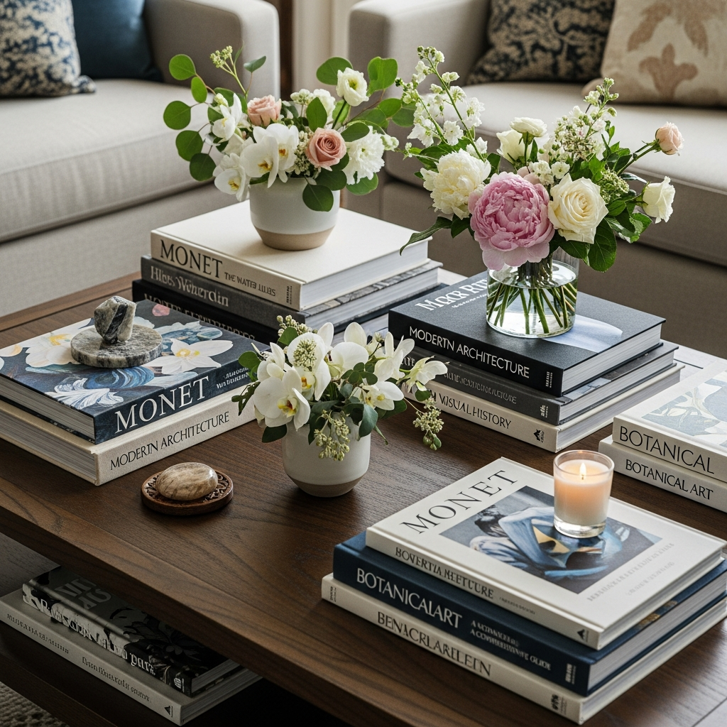 Combine intellectual curiosity with natural beauty. Stack a few oversized art or photography books and top them with a small, delicate floral arrangement. Think peonies, ranunculus, or sprigs of eucalyptus in a small, understated vase. This pairing suggests a refined appreciation for both culture and nature.