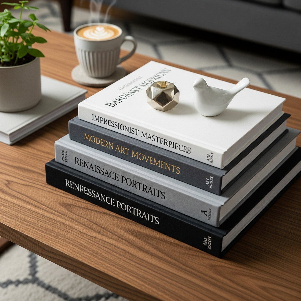 Begin with a foundation of large, beautiful art or design books. Choose books with aesthetically pleasing covers and spines in complementary colors, perhaps deep blues, muted greens, or sophisticated neutrals. Stack them neatly in groups of two or three. The visual weight of the books creates an anchors for your arrangement.