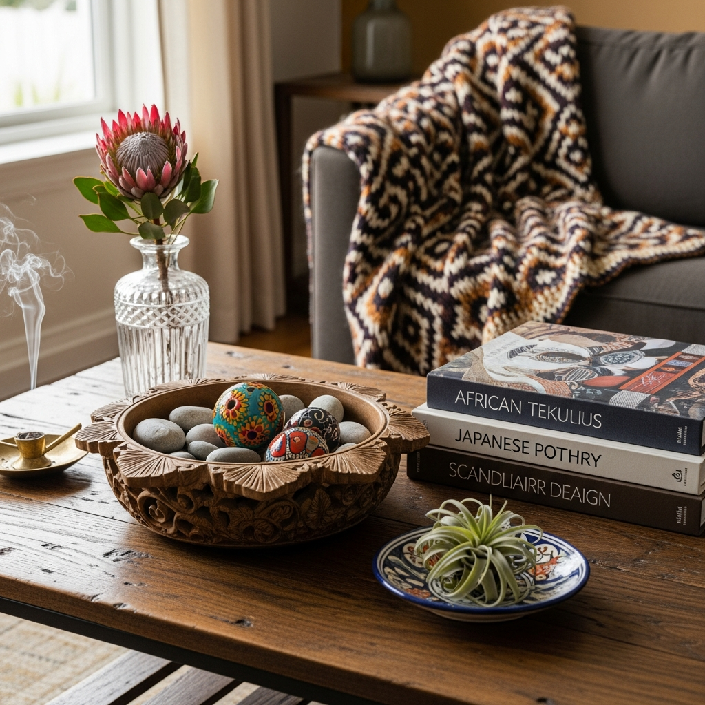 Introduce pieces that tell a story from around the world. A hand-carved wooden bowl from Africa, a woven rattan box from Southeast Asia, or a unique ceramic piece from a local artisan can add character. Mix these with simple, contemporary elements to create a cultured and well-traveled aesthetic without being overly thematic.