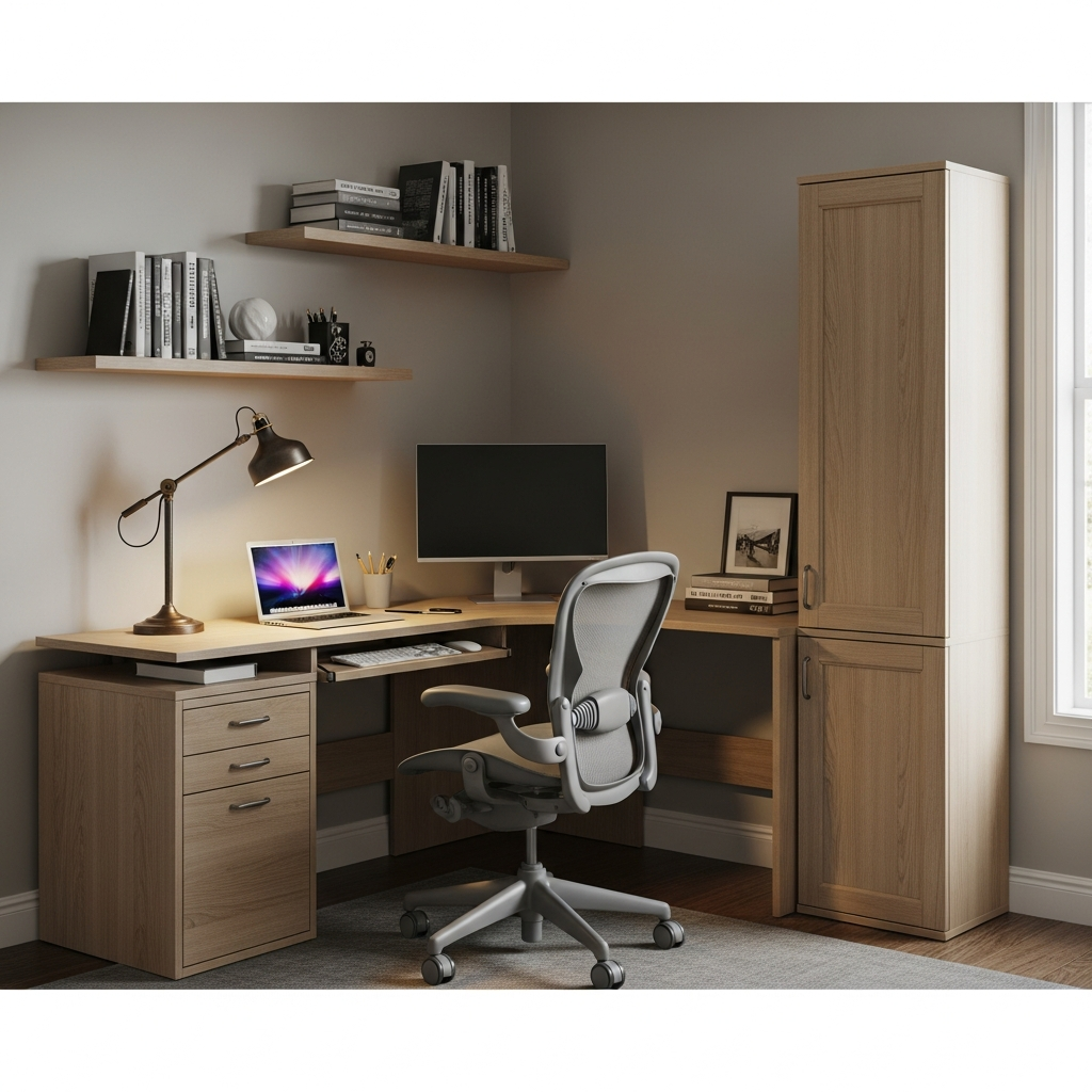 Picture a sleek, L-shaped desk in a light ash wood, perfectly fitted into a corner. It features drawers, open shelving for books, and perhaps a subtle filing cabinet. The clean lines and organized structure foster a focused and efficient work environment.