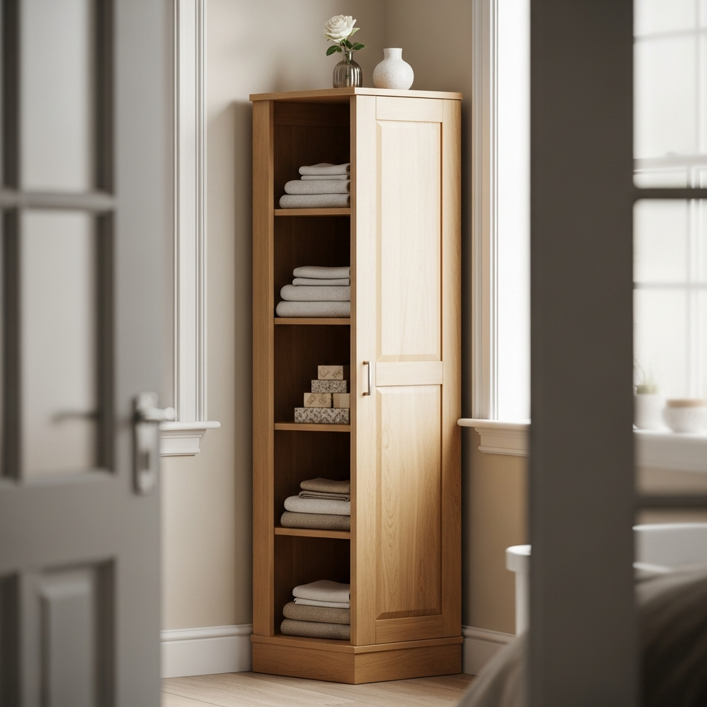 Sometimes you just need extra storage for linens, towels, or bathroom essentials. A tall, narrow corner cabinet is ideal for maximizing vertical space in hallways, bathrooms, or even a utility room.