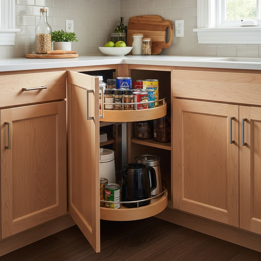 Maximizing accessibility in a kitchen corner, an angled base cabinet fitted with a lazy Susan is incredibly practical. This allows you to utilize the deepest parts of the cabinet with ease, perfect for pots, pans, or pantry items.