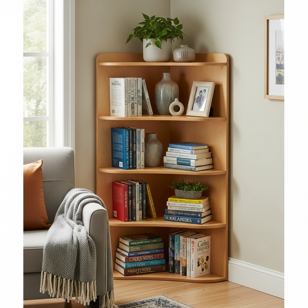 Move beyond sharp angles with a beautifully curved corner bookshelf. This design softens the look of a room while providing ample space for your literary collection and decorative accents. The gentle lines create a welcoming and inviting feel.