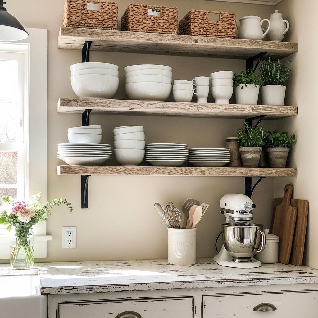 Open shelving is a hallmark of cottage style, offering both practicality and visual appeal. Display your prettiest dishware, quaint teacups, and glass jars filled with pantry staples. This approach keeps essentials within easy reach while adding an airy, lived-in feel to your walls. The casual arrangement fosters a warm, approachable atmosphere.