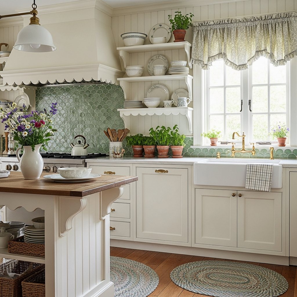 Scalloped edges, whether on a valance, a small shelf, or even cabinet trim, introduce a touch of whimsical charm and softness. This subtle design element is a nod to traditional cottage aesthetics, adding an unexpected layer of detail that feels both refined and utterly sweet. It breaks up straight lines with gentle curves.