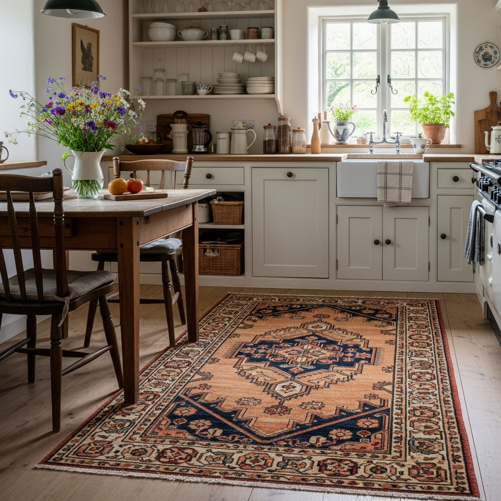 A soft area rug can instantly define a space and add a layer of comfort underfoot, especially in larger kitchens. Choose a washable rug with a classic pattern, like a subtle stripe, a small floral, or a simple weave, in colors that complement your palette. It dampens sound and adds visual warmth.
