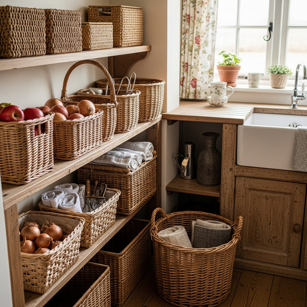 Baskets are both functional and decorative, perfect for cottage kitchens. Use them to store root vegetables, extra linens, or even small appliances, keeping clutter at bay while adding organic texture. Rattan, wicker, or seagrass baskets instantly bring a rustic, handcrafted element to the space, enhancing its natural charm.