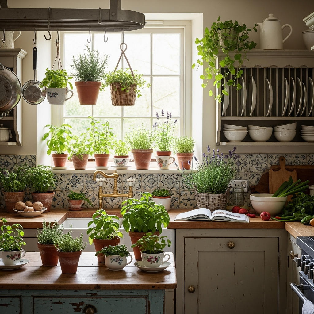 Bring life into your kitchen with potted herbs like rosemary, basil, or mint, placed on a windowsill or countertop. Small flowering plants or a trailing ivy can also add a fresh, organic touch. Greenery instantly refreshes the space, offering vibrant color and a connection to nature, making the kitchen feel more alive and homely.
