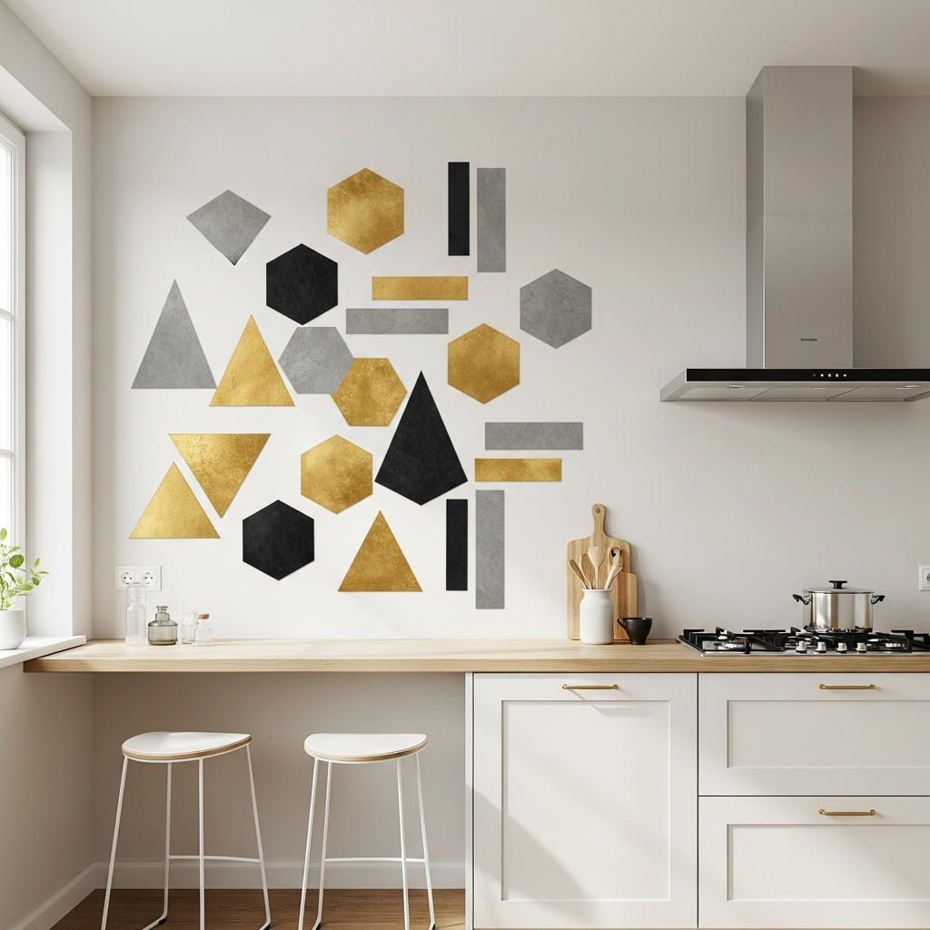 For a contemporary and easily changeable option, consider geometric wall decals. These can add abstract patterns, lines, or shapes to a wall without the commitment of wallpaper. Choose metallic decals for a sophisticated shimmer or a contrasting color to add a playful yet chic touch to a minimalist kitchen.