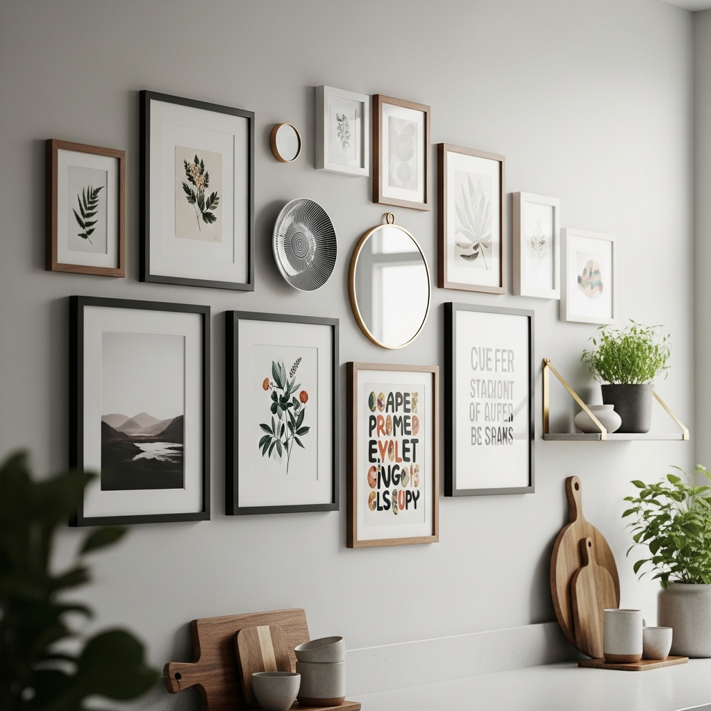 Transform a large empty wall into a dynamic visual story with a thoughtfully curated gallery. Mix and match framed prints, botanical illustrations, vintage culinary posters, or even pressed herbs. Choose frames in varying sizes and materialsโthink brass, natural wood, or sleek blackโto create depth. This allows for a personal expression, adding warmth and conversation to your kitchen.