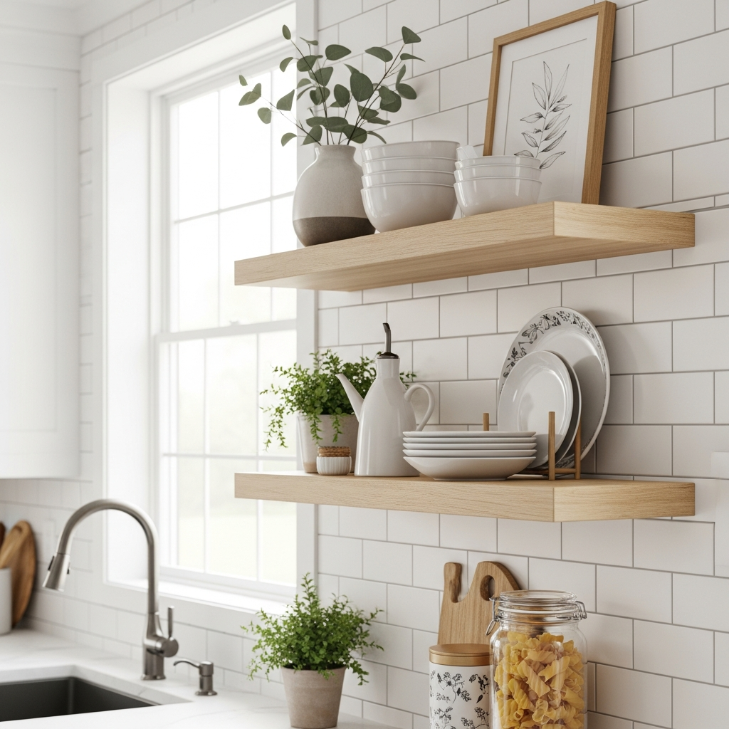 Replace bulky upper cabinets with stylish open shelves to display your favorite dishware, cookbooks, or decorative ceramics. Opt for floating shelves in reclaimed wood for a rustic charm, or minimalist white shelves for a clean, modern look. The arrangement itself becomes a form of art, bringing texture and an airy feel to your kitchen, making it feel larger and more inviting.