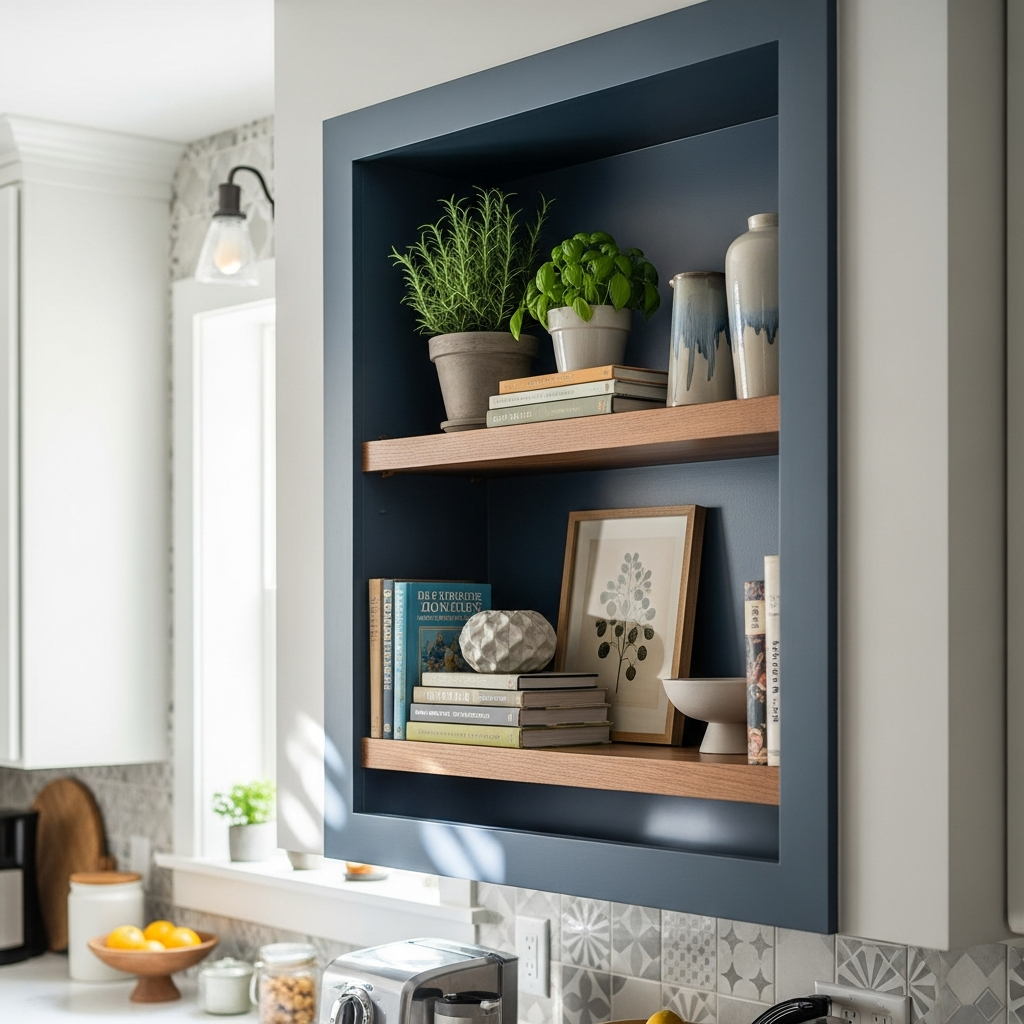 Create a bespoke architectural element by installing a small, recessed shelf nook in an empty wall space. Line it with a contrasting color or texture, and use it to display a single meaningful object, a small plant, or a tiny collection. This adds an element of custom design and a refined focal point, showcasing thoughtful detail.