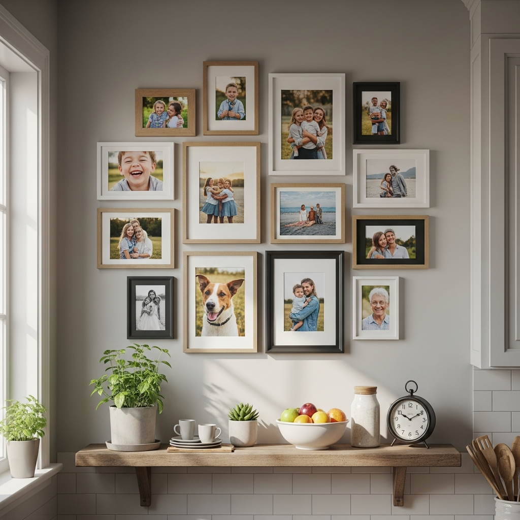 Curate a warm and inviting atmosphere by displaying framed family photos. Focus on candid moments in the kitchen or around food to tie into the room’s purpose. Use uniform frames for a cohesive look or mix them for a more relaxed, personal touch. It infuses the space with love and cherished memories.