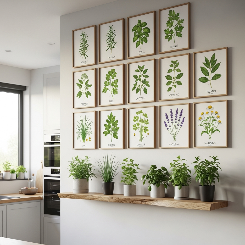Adorn your kitchen walls with a series of botanical prints depicting herbs, fruits, or vegetables. Choose elegant frames and arrange them in a grid for a clean, structured look or more loosely for an eclectic feel. These prints bring a fresh, natural element to the kitchen, celebrating the essence of food and nature.