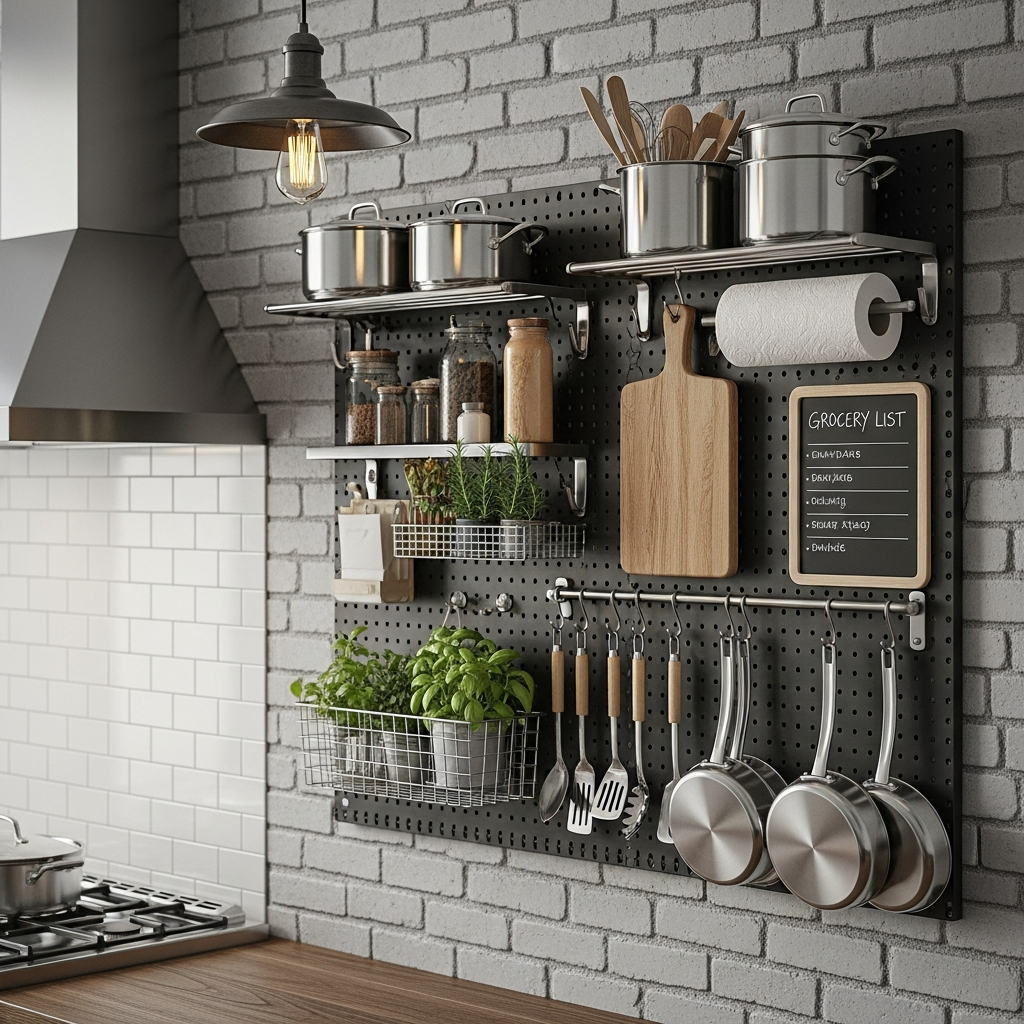 For a blend of utility and style, install an industrial-chic pegboard system. Perfect for hanging pots, pans, utensils, and small decorative items, it keeps essentials within reach while looking incredibly organized. A dark-colored pegboard against a light wall creates a striking contrast, lending a modern, professional kitchen feel.