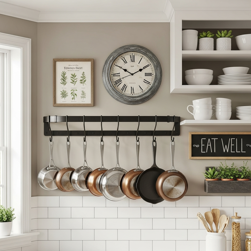 Free up cabinet space and add a touch of professional kitchen style with a wall-mounted pot rack. Beyond its practicality, a sleek black, brushed steel, or hammered copper pot rack with gleaming cookware displayed can be a beautiful focal point. It brings an element of industrial chic or farmhouse utility, depending on its design.
