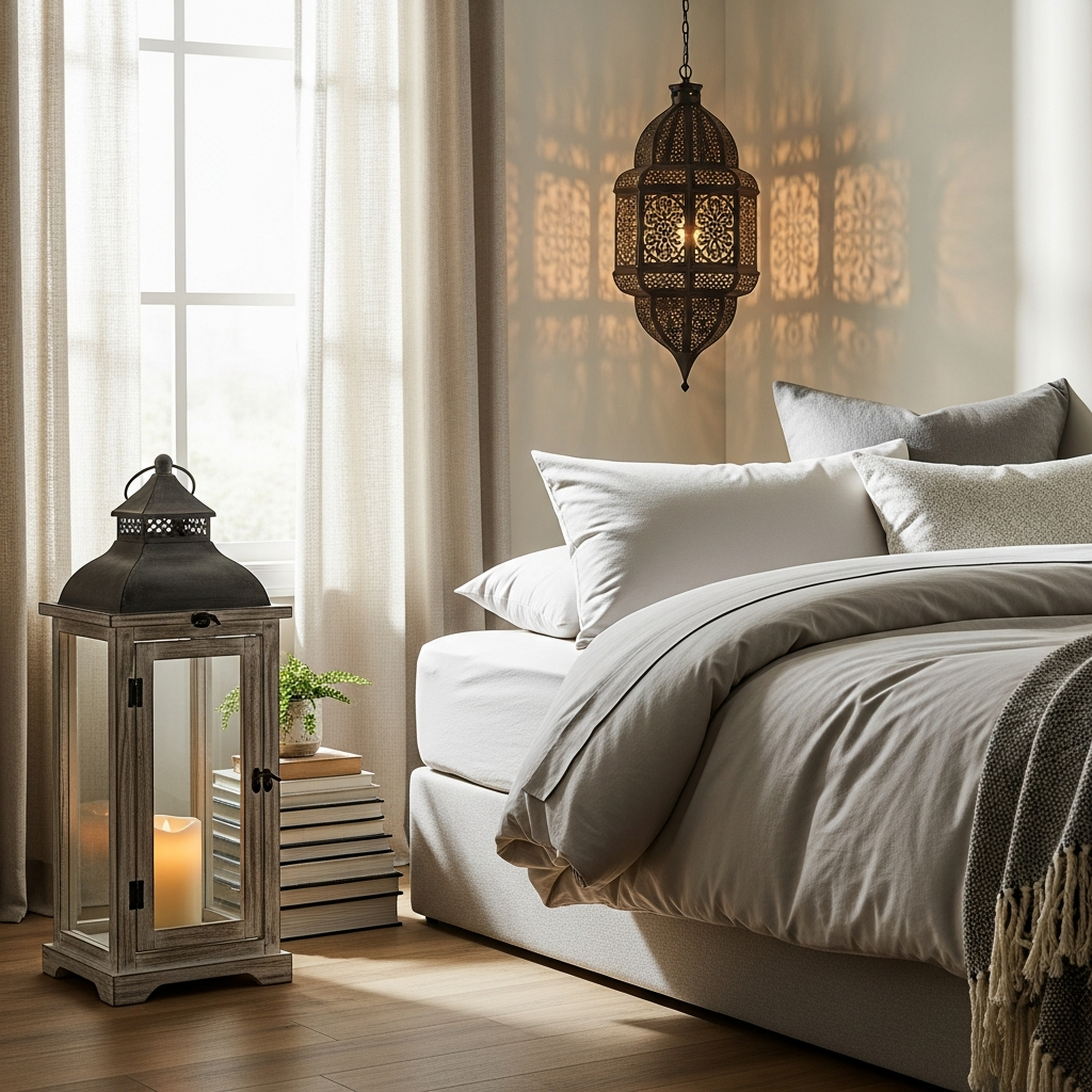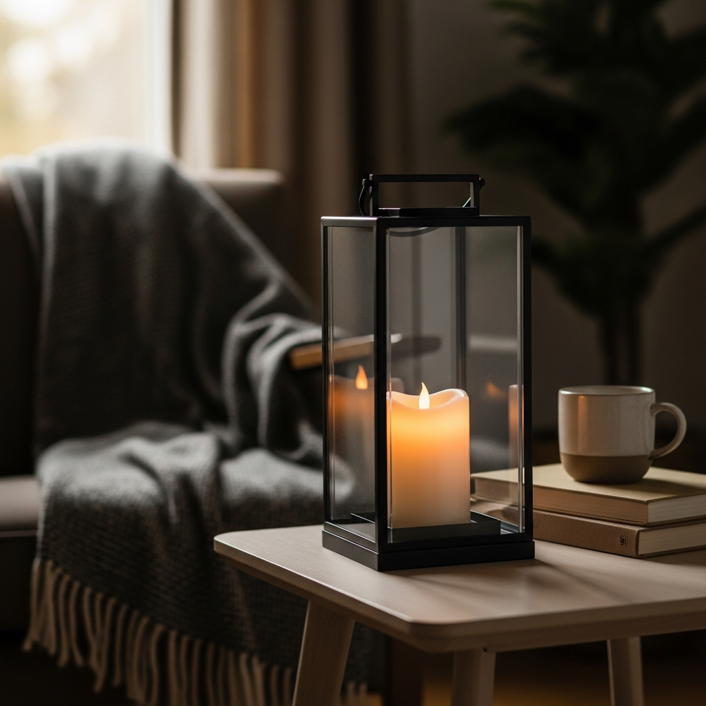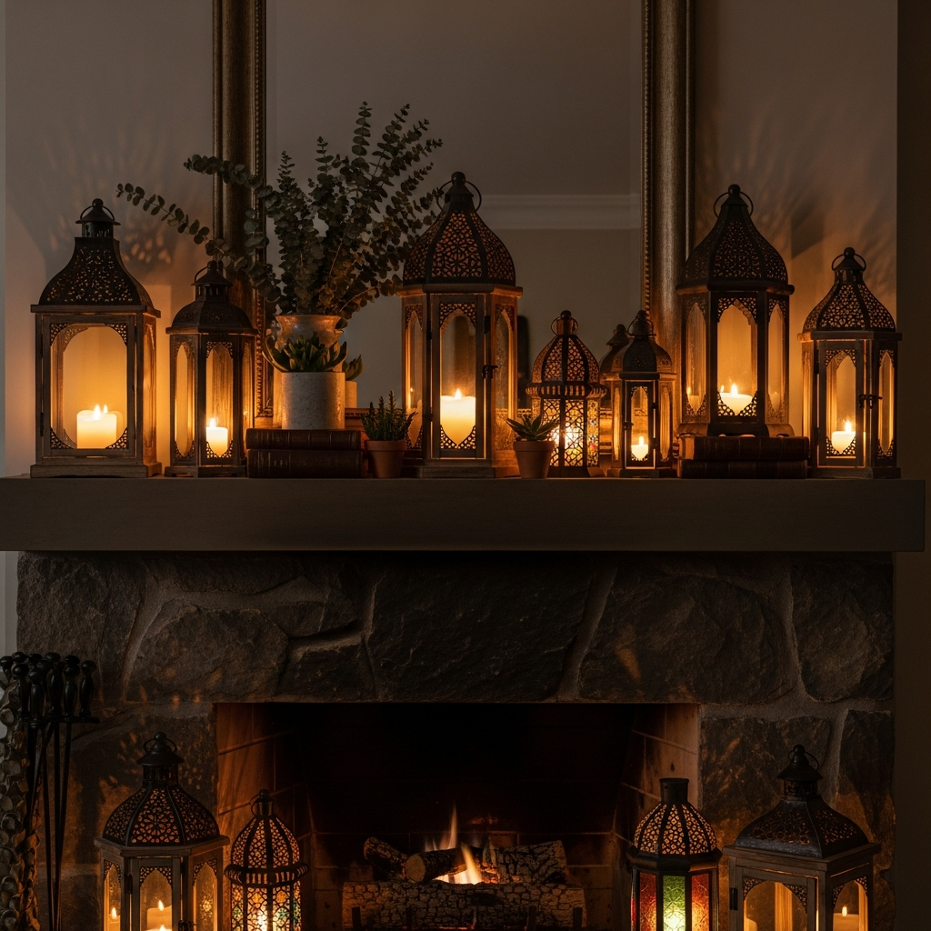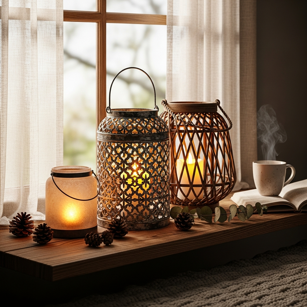 Choose lanterns made from dark metal or antiqued brass for a touch of vintage elegance. Pair them with natural elements like dried eucalyptus, a stack of worn books, or small ceramic sculptures. The interplay of soft light and varied textures creates a serene, welcoming atmosphere, perfect for unwinding.
