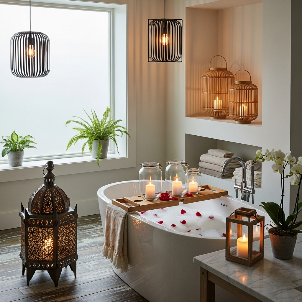 Small, elegant lanterns in chrome, brushed nickel, or ceramic are perfect for a sophisticated bathroom. Surround them with fluffy towels, scented candles, and fresh flowers or eucalyptus branches. The soft, diffused light helps to unwind and create a peaceful, indulgent escape from the dayโs stresses.