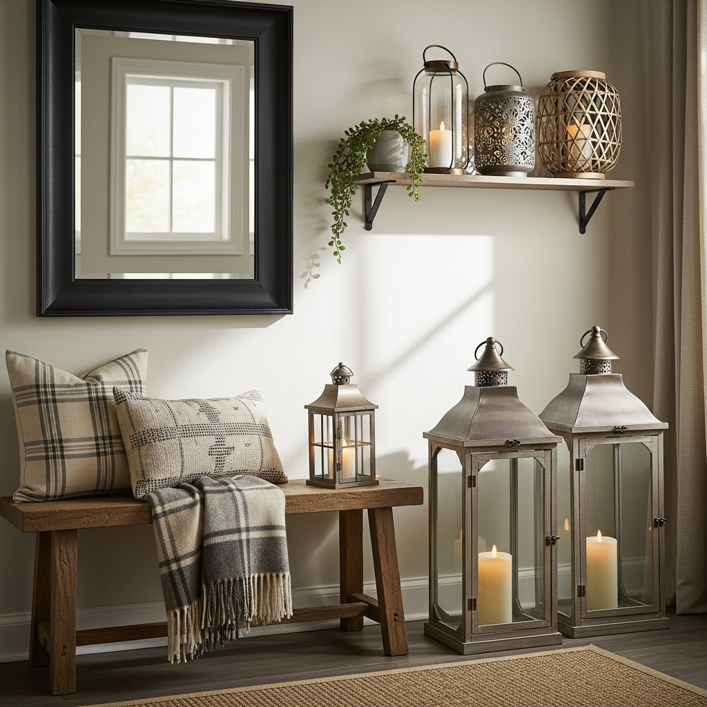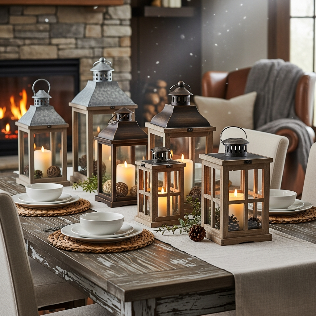 Look for lanterns in aged metal, whitewashed wood, or with chicken wire details. Pair them with elements like burlap runners, antique stoneware, and plaid textiles. This combination evokes a sense of timeless simplicity and warmth, making any room feel like a comforting country retreat.